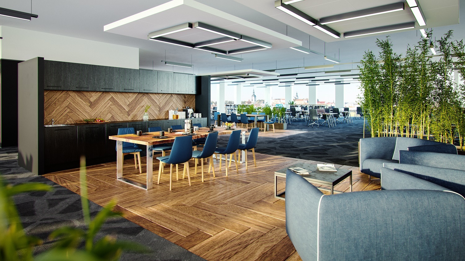Moodsat kooslust kaupluste ja büroopindadest iseloomustab avarus, valgusküllasus ja elegants. 3. korruse tasandil on klaaskatusega bürootänav, mis ühendab kuues korpuses asuvaid büroopindasid. Bürookeskus ja PF ehitatakse LEED Gold nõuded jälgides.